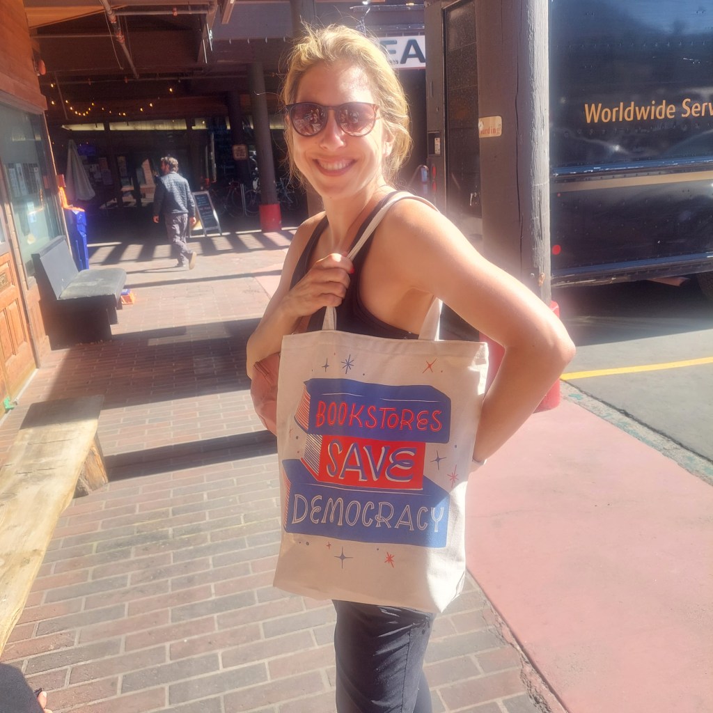 While I was in Mammoth, we wandered into a bookstore and I bought a canvas bag that said, “Bookstores save democracy.”